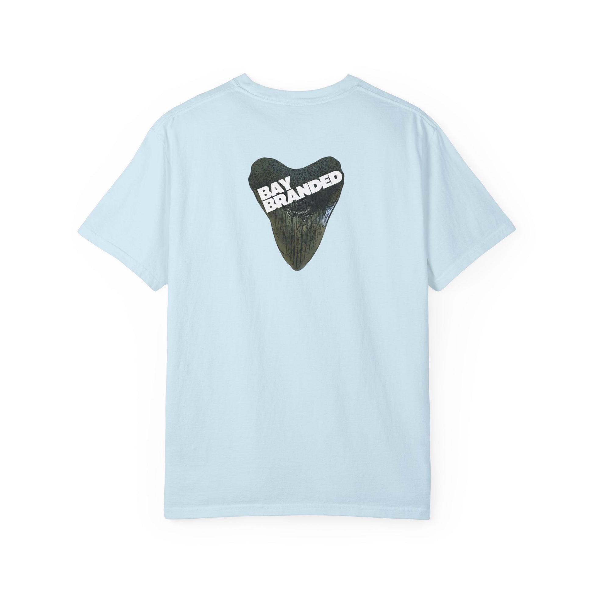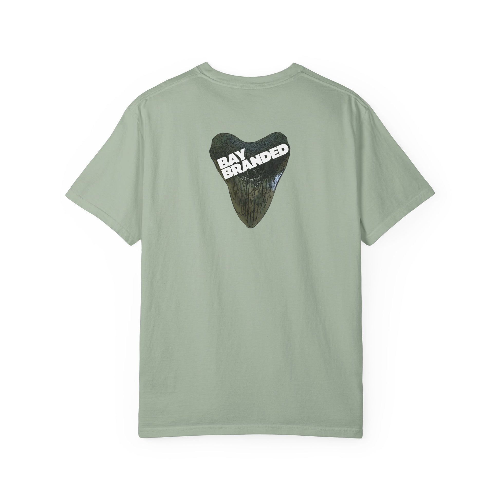 This relaxed, comfort colors garment-dyed tee carries a quiet, lived-in energy — soft to the touch, built to last, and ready for the water, the pier, or a slow weekend drive. The front and back graphic has the Bay Branded logo. The graphic blends a Meglodon sharkstooth with a subtle shout to days on the bay. Wear it over board shorts after a morning cast, paired with worn-in jeans for an evening bonfire, or layered under a flannel when the wind comes off the bay. The medium-weight cotton settles comfortably on the shoulders and softens further with every wash, while the relaxed cut leaves room for movement and a casual vibe. This shirt is for people who value texture, color that feels natural, and artwork that carries memory — of tides, local haunts, and easy afternoons spent where land meets sea.