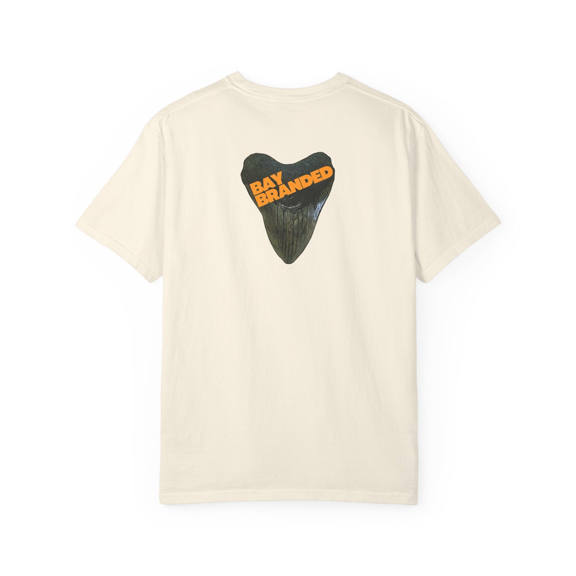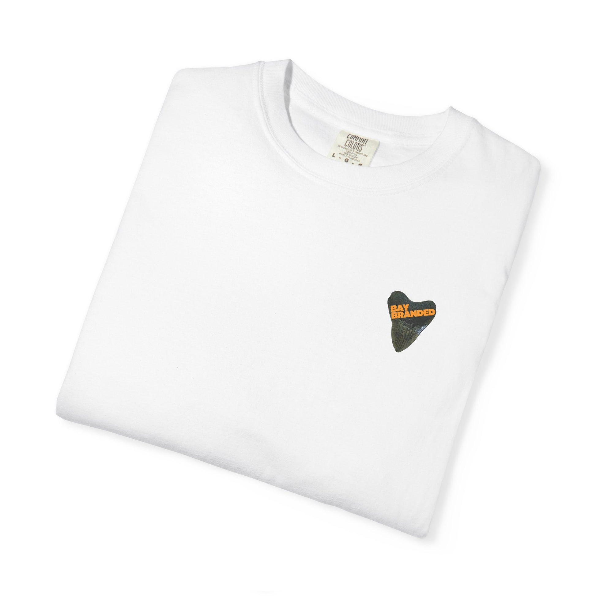 This relaxed, comfort colors garment-dyed tee carries a quiet, lived-in energy — soft to the touch, built to last, and ready for the water, the pier, or a slow weekend drive. The front and back graphic has the Bay Branded logo. The graphic blends a Meglodon sharkstooth with a subtle shout to days on the bay. Wear it over board shorts after a morning cast, paired with worn-in jeans for an evening bonfire, or layered under a flannel when the wind comes off the bay. The medium-weight cotton settles comfortably on the shoulders and softens further with every wash, while the relaxed cut leaves room for movement and a casual vibe. This shirt is for people who value texture, color that feels natural, and artwork that carries memory — of tides, local haunts, and easy afternoons spent where land meets sea.