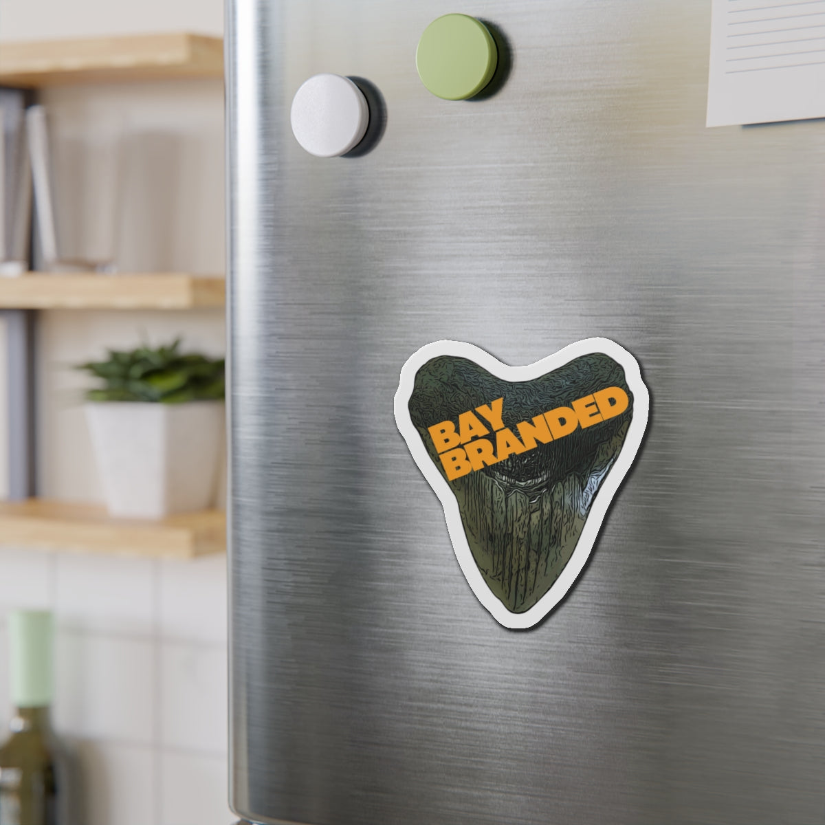 A Bay Branded logo magnet that brings personality to everyday surfaces. This matte-finish vinyl magnet shows crisp, vibrant printing on a flexible, durable body with a bold black backing. Lightweight and weather-resistant, it clings to fridges, lockers, whiteboards, or any magnetic metal and keeps your favorite artwork or message on display. Available in five sizes to fit small reminders or standout statements, it arrives cut to shape with a clean white border that highlights the design. Use it to mark your space, decorate a studio or kitchen, or add a little attitude to a metal surface.