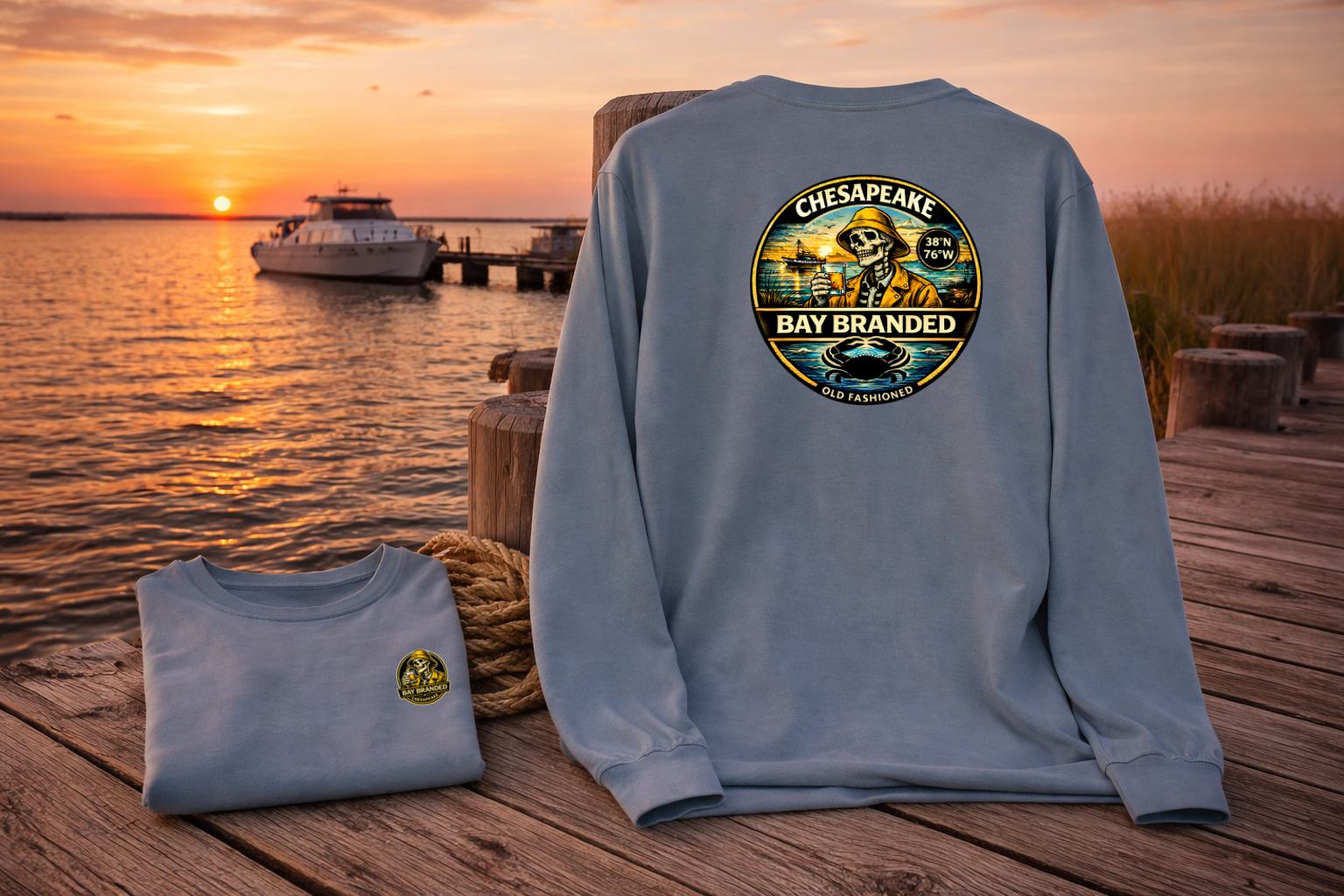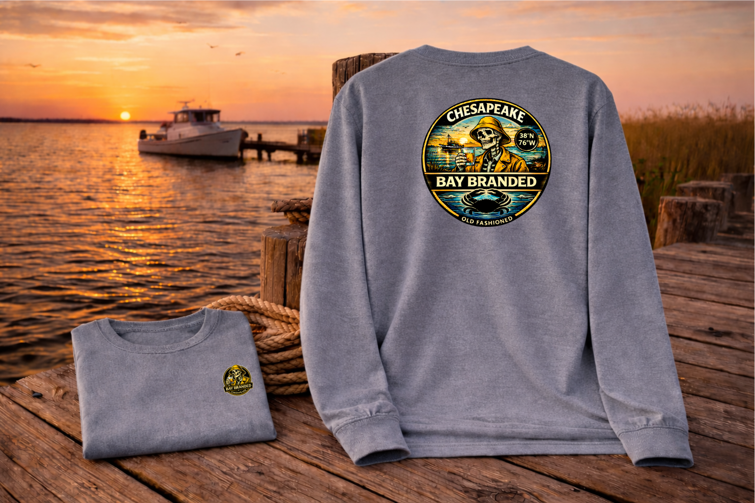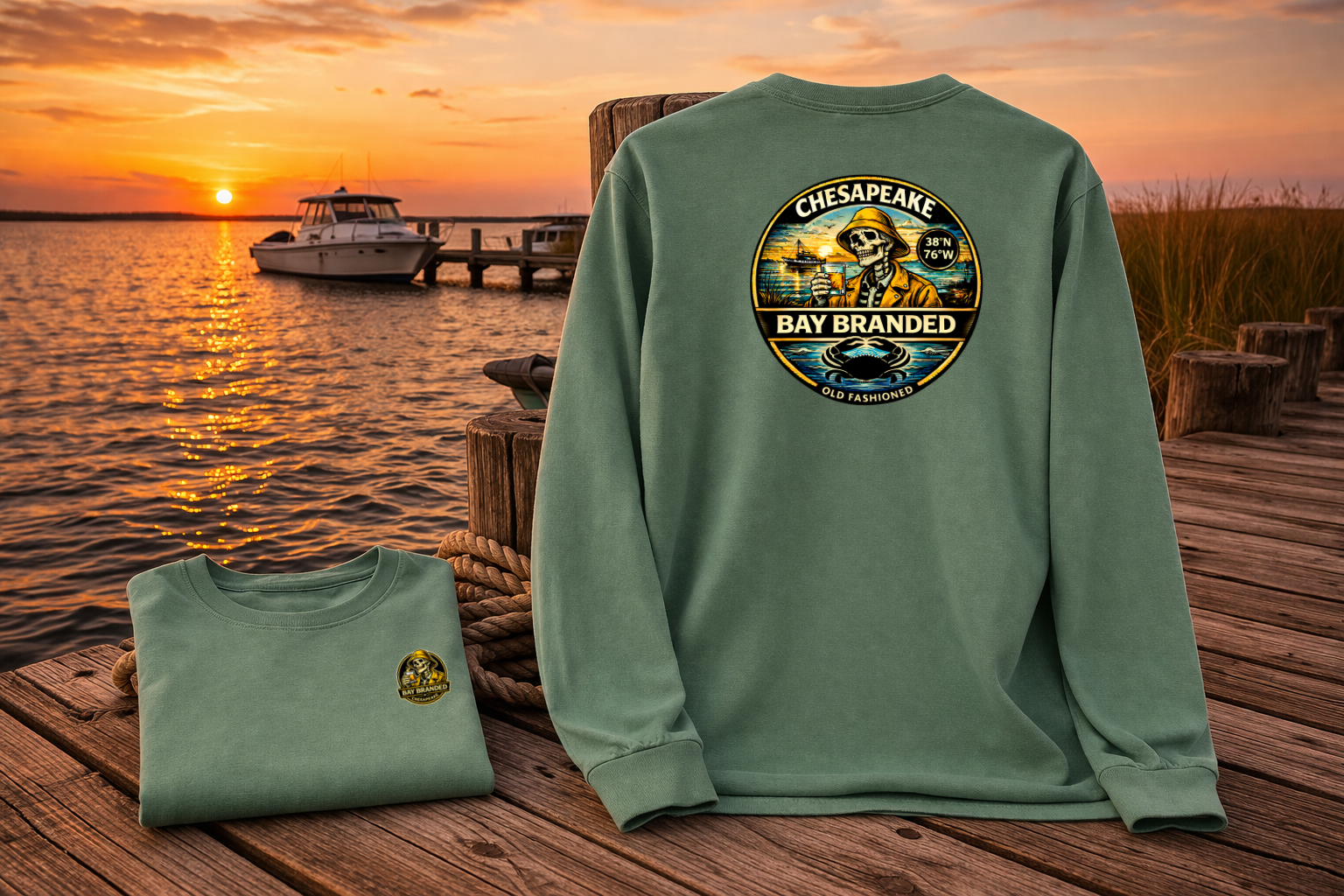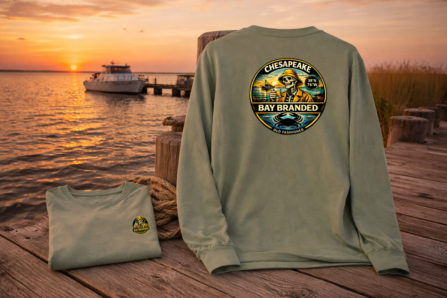 The back graphic centers around a bold, heritage-style Chesapeake badge that feels pulled straight from an old marina sign. BAY BRANDED arches strong across the top, while CHESAPEAKE anchors the base — balanced, confident, and built to last. Flanked by Est. 2018, the mark nods to the roots of the brand and the steady growth of something grounded in real Bay life.