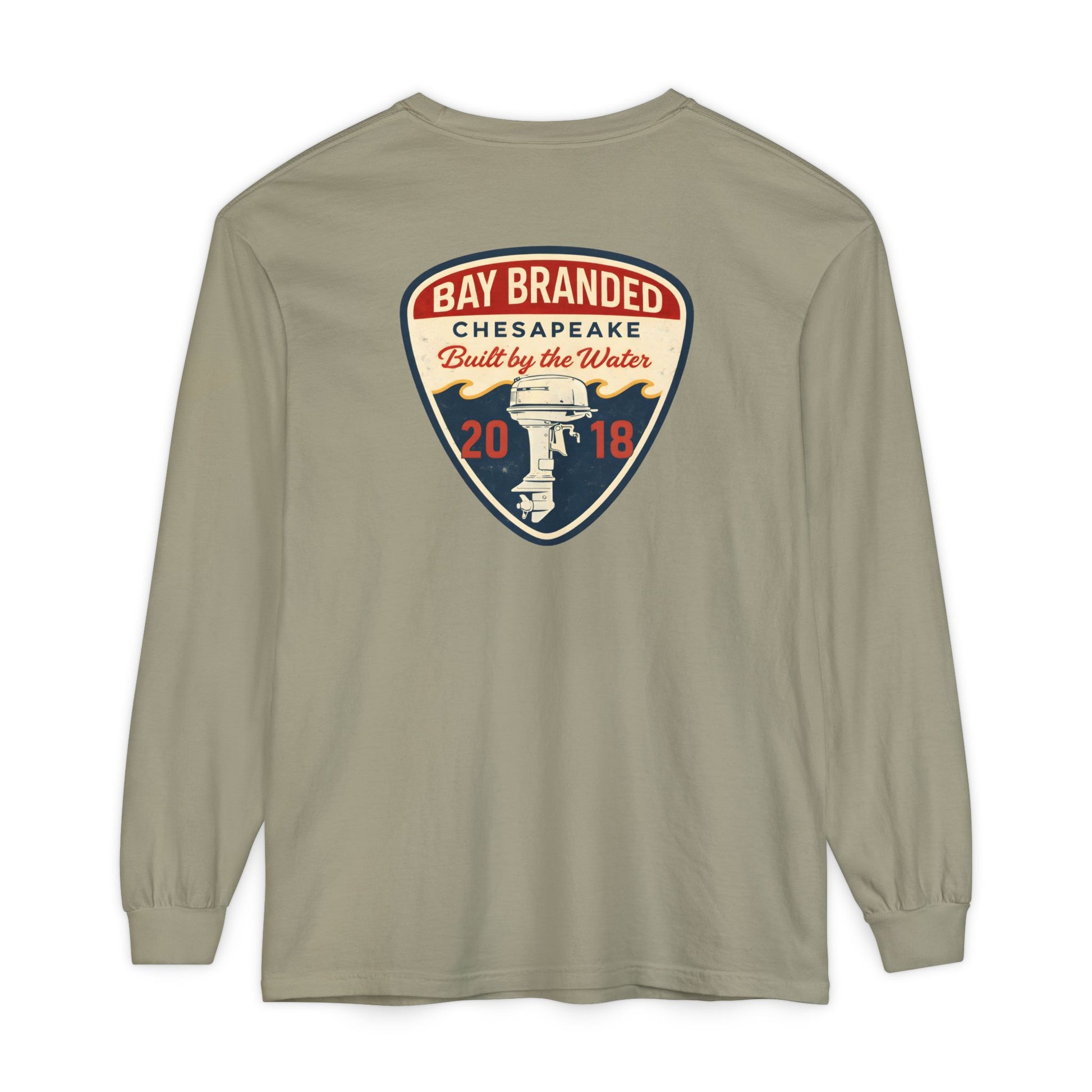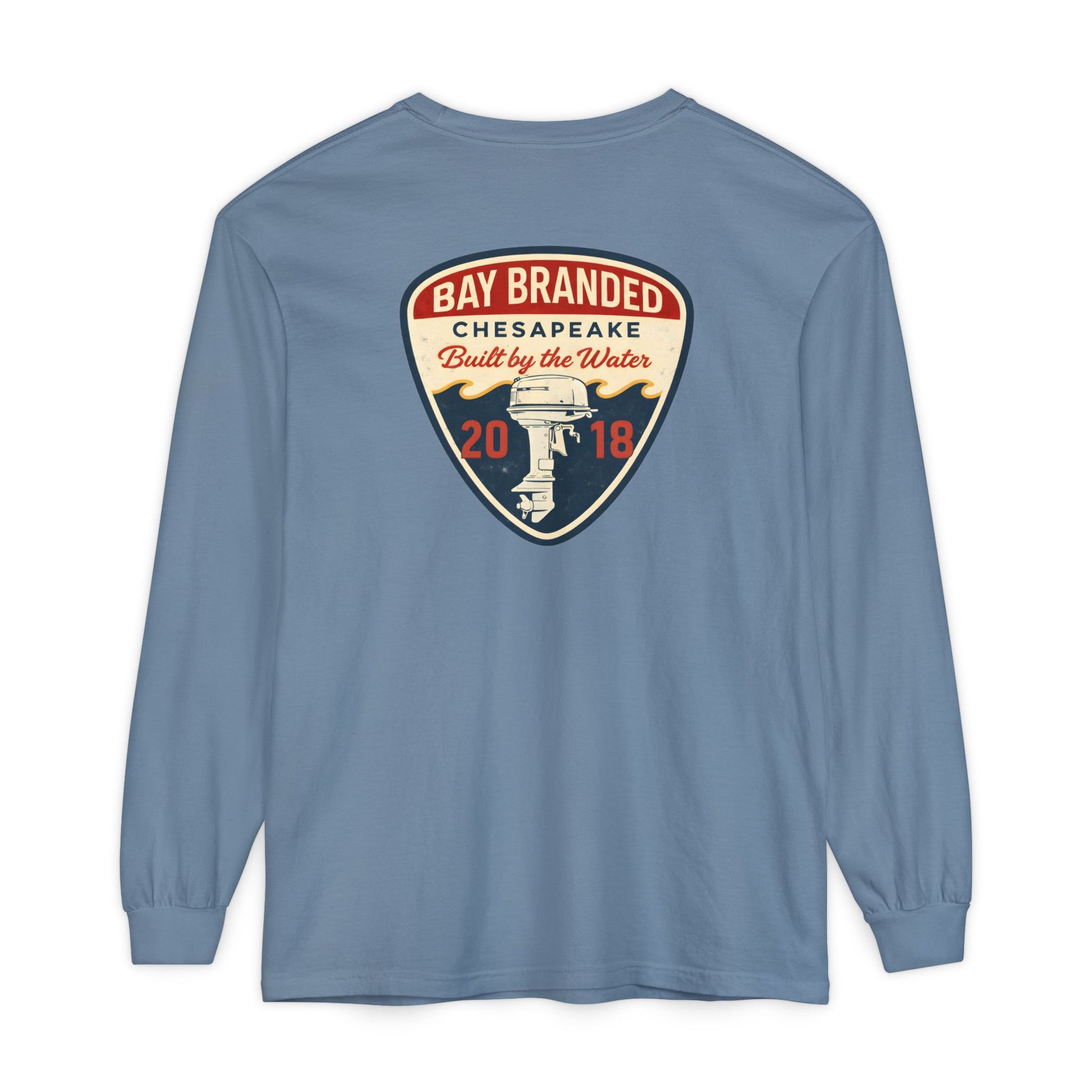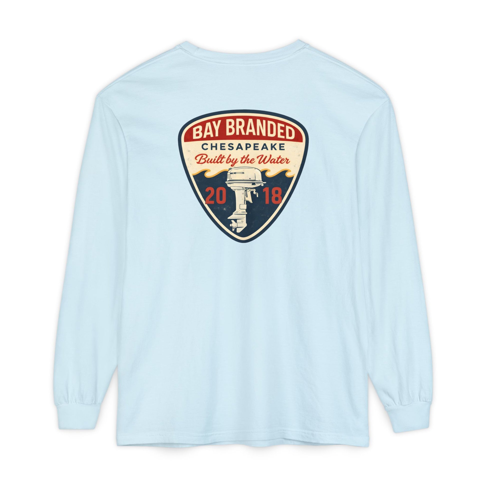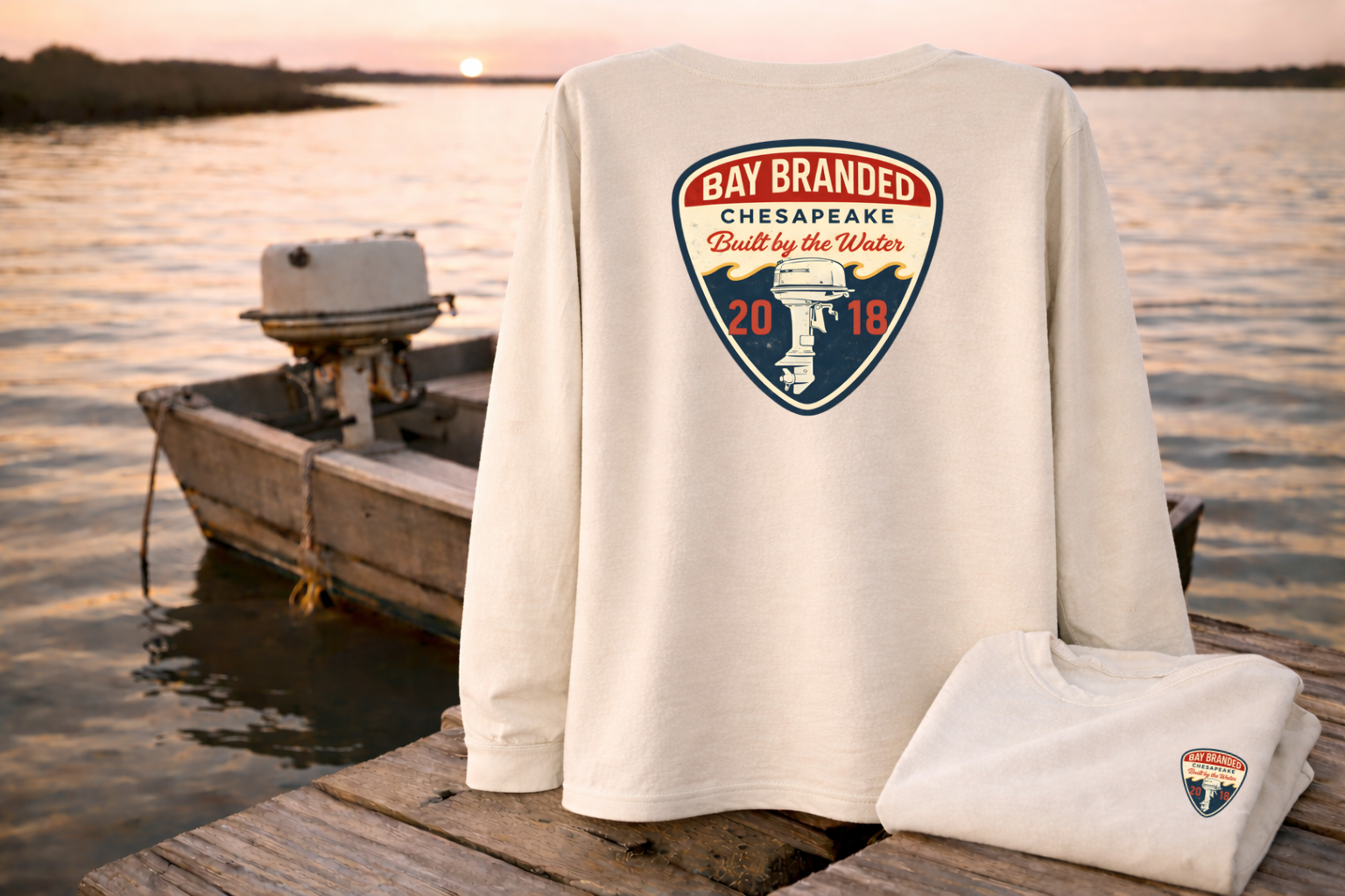 The back graphic features a bold Chesapeake badge with BAY BRANDED up top, CHESAPEAKE grounded below, and Built by the Water flowing through the center. Flanked by 2018, it marks the roots of a brand built on real Bay life.