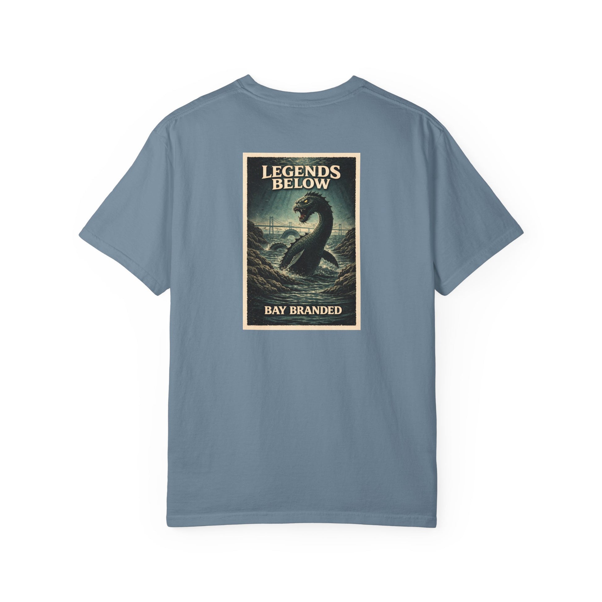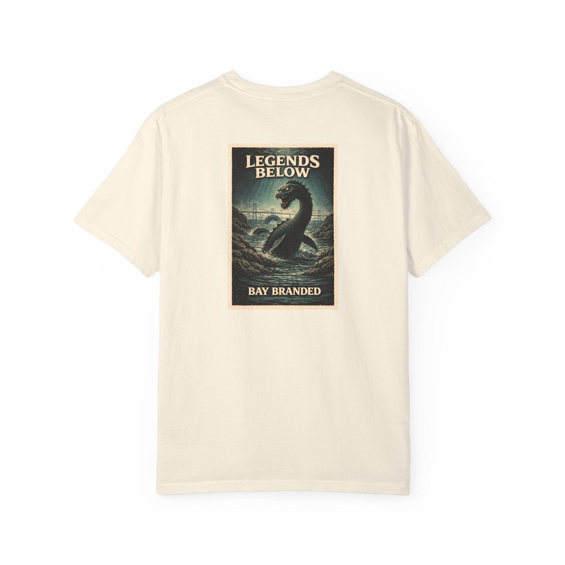 The front carries the BAY BRANDED® mark—simple, confident, and rooted. The back graphic draws from one of the Chesapeake Bay’s most enduring legends: Chessie, the elusive sea creature said to surface in foggy channels and shadowed coves. A symbol of mystery and local lore, Chessie represents the stories passed down dockside—glimpses in low light, ripples without a source, and the feeling that the Bay still keeps its secrets.