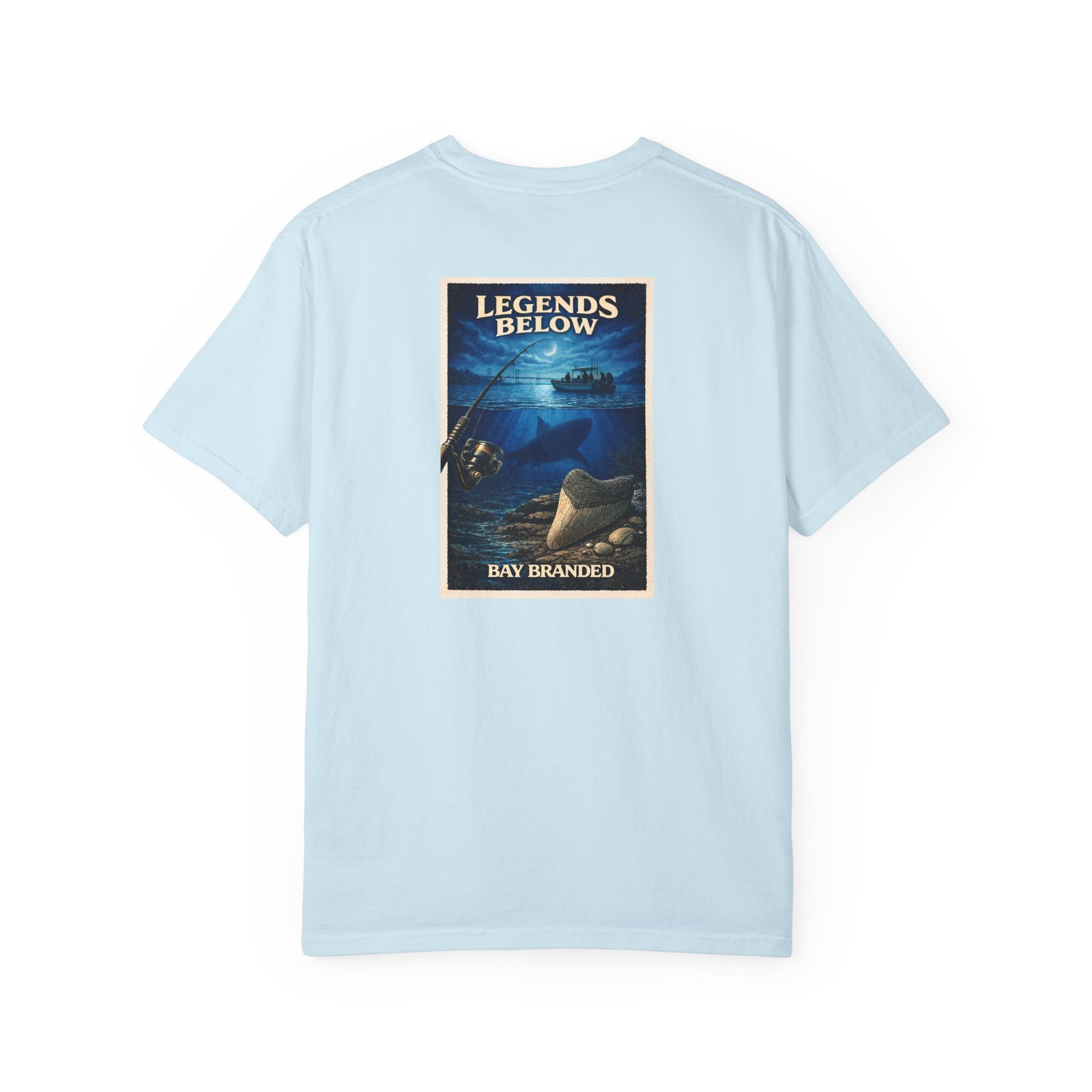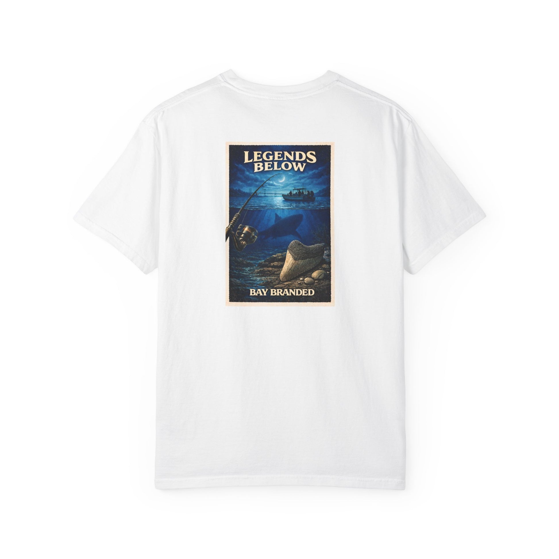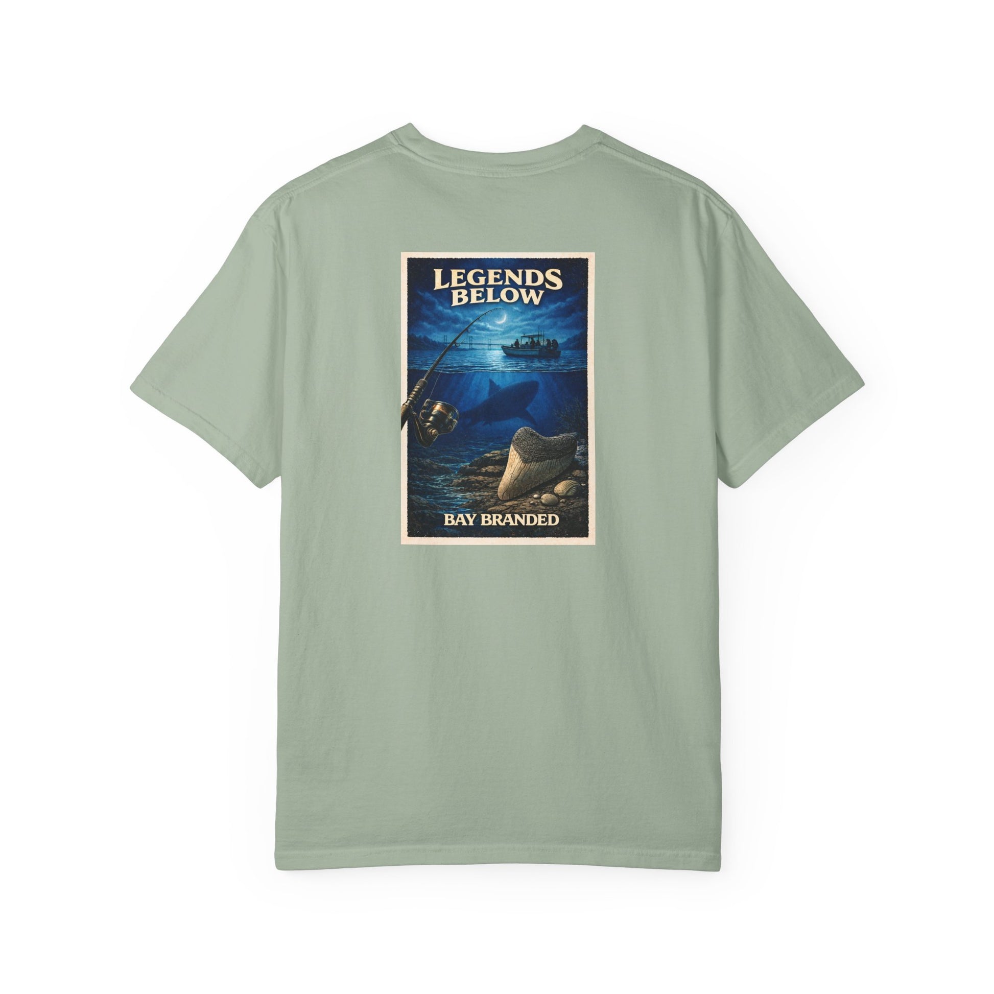 The front carries the BAY BRANDED® mark—simple, confident, and rooted. The back graphic tells a layered story of the Bay itself. Beneath the surface, an ancient Megalodon moves through the dark water, a reminder of the apex predator that once ruled these seas. In the forefront, a Megalodon shark tooth stands as a bridge to the present—fossilized proof of that deep history, still found along the Bay’s shores and bottom today. Tying it all together, modern-day fishing unfolds at the surface, paying tribute to the people who live and work on the water now, carrying the Bay’s legacy forward.