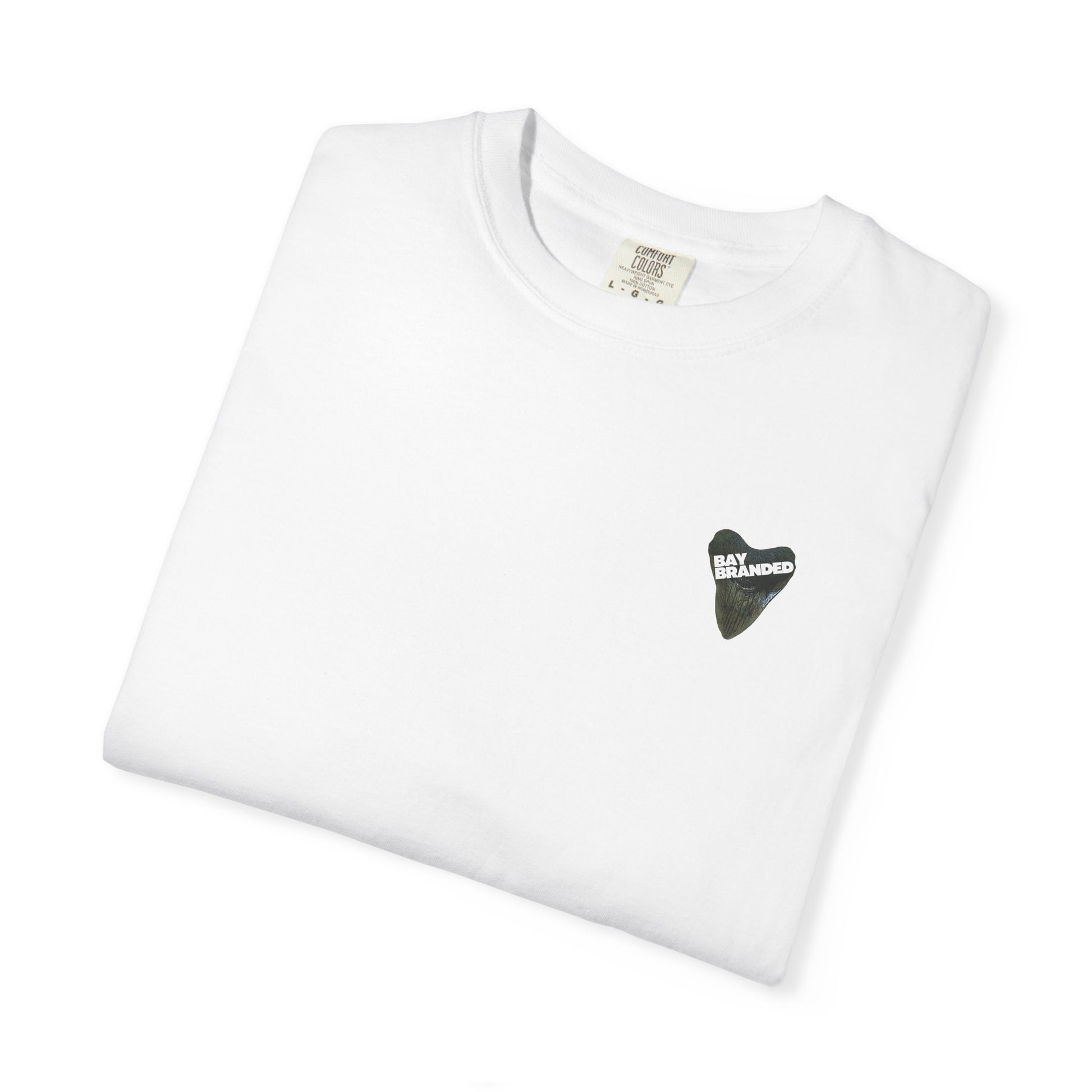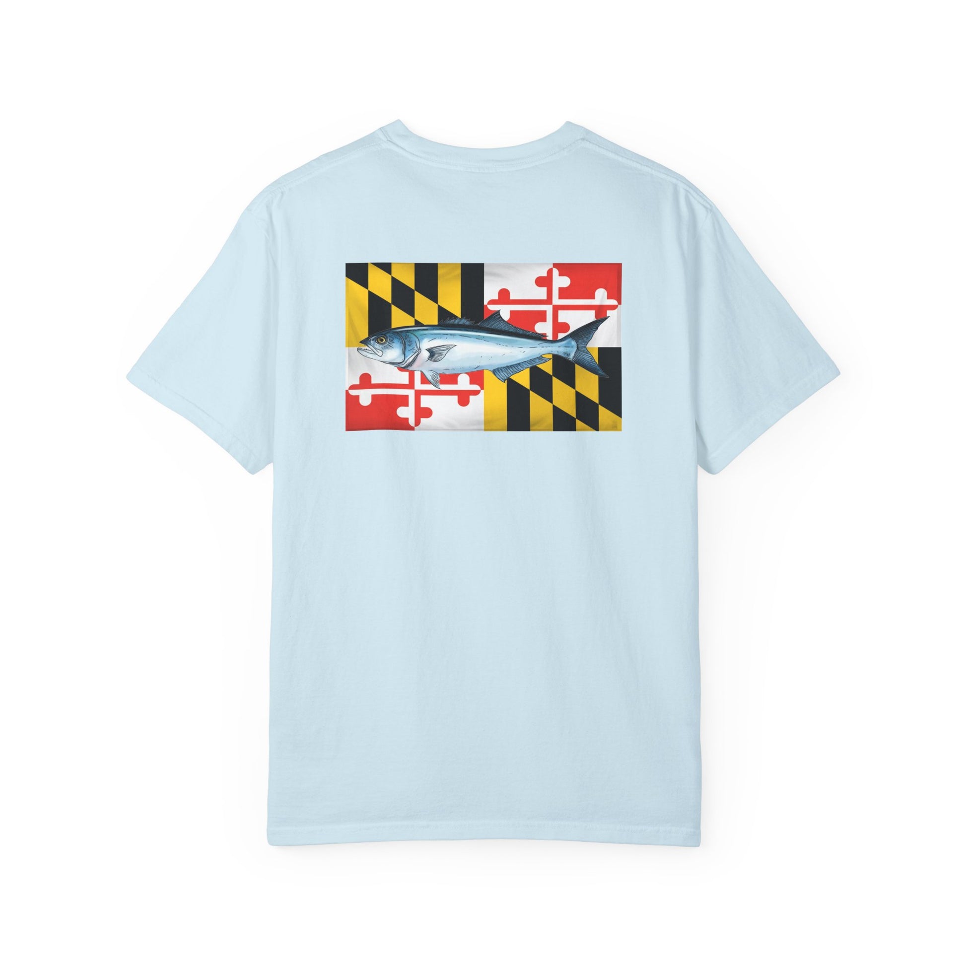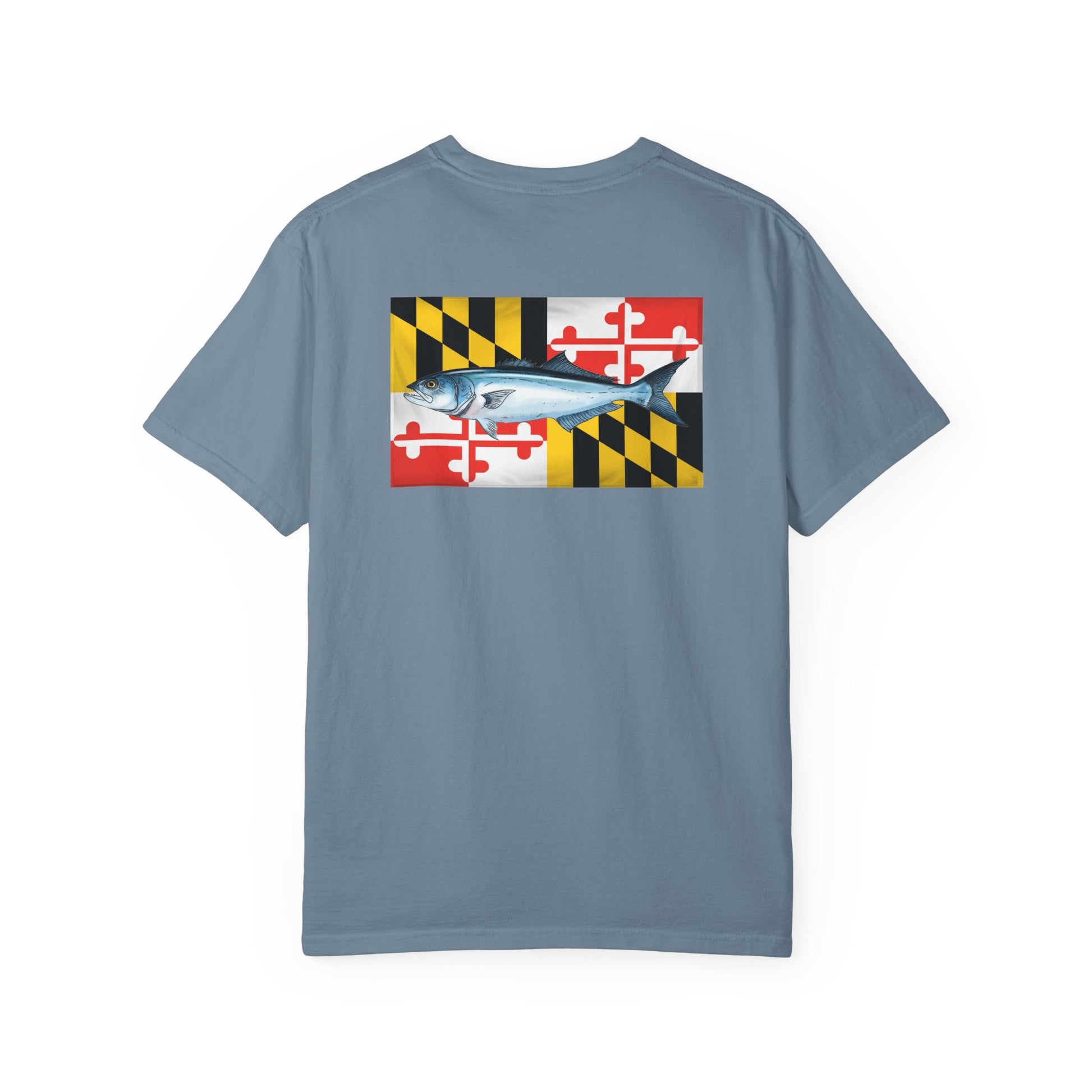 This relaxed, comfort colors garment-dyed tee carries a quiet, lived-in energy — soft to the touch, built to last, and ready for the water, the pier, or a slow weekend drive. The front graphic has the Bay Branded logo. The back graphic blends a bluefish with Maryland’s distinctive flag panels, a subtle shout to coastal days and state pride without shouting. Wear it over board shorts after a morning cast, paired with worn-in jeans for an evening bonfire, or layered under a flannel when the wind comes off the bay. The medium-weight cotton settles comfortably on the shoulders and softens further with every wash, while the relaxed cut leaves room for movement and a casual vibe. This shirt is for people who value texture, color that feels natural, and artwork that carries memory — of tides, local haunts, and easy afternoons spent where land meets sea.