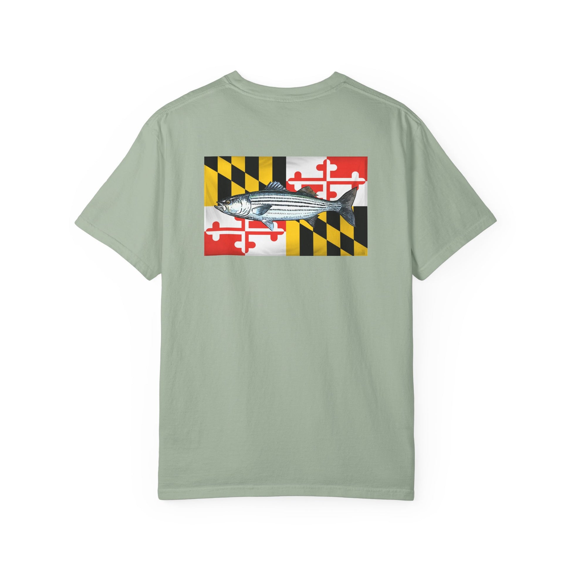 This relaxed, comfort colors garment-dyed tee carries a quiet, lived-in energy — soft to the touch, built to last, and ready for the water, the pier, or a slow weekend drive. The front graphic has the Bay Branded logo. The back graphic blends a striped fish with Maryland’s distinctive flag panels, a subtle shout to coastal days and state pride without shouting. Wear it over board shorts after a morning cast, paired with worn-in jeans for an evening bonfire, or layered under a flannel when the wind comes off the bay. The medium-weight cotton settles comfortably on the shoulders and softens further with every wash, while the relaxed cut leaves room for movement and a casual vibe. This shirt is for people who value texture, color that feels natural, and artwork that carries memory — of tides, local haunts, and easy afternoons spent where land meets sea.
